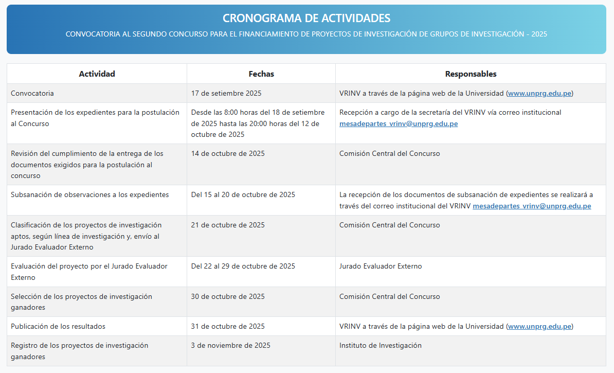 El Vicerrectorado de Investigación, se llevará a cabo la Convocatoria al Segundo Concurso para el Financiamiento de Proyectos de Investigación de Grupos de Investigación – 2025.
