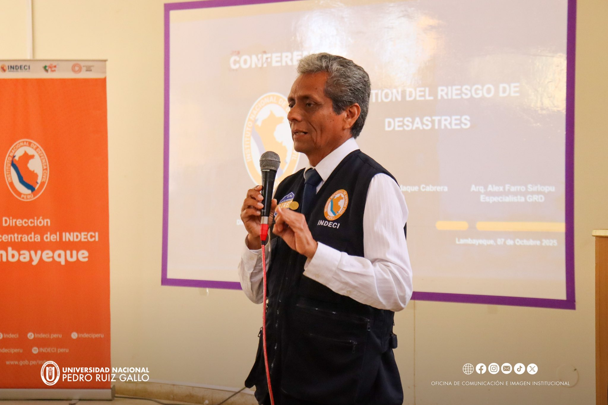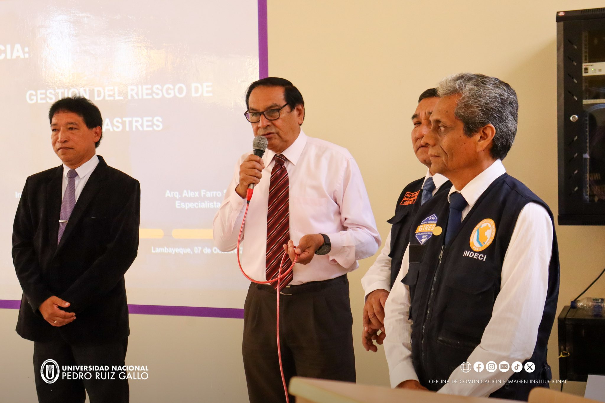 Estudiantes de la Universidad Nacional Pedro Ruiz Gallo participaron activamente en la jornada de capacitaciรณn organizada por INDECI, desarrollada en nuestra casa superior de estudios.