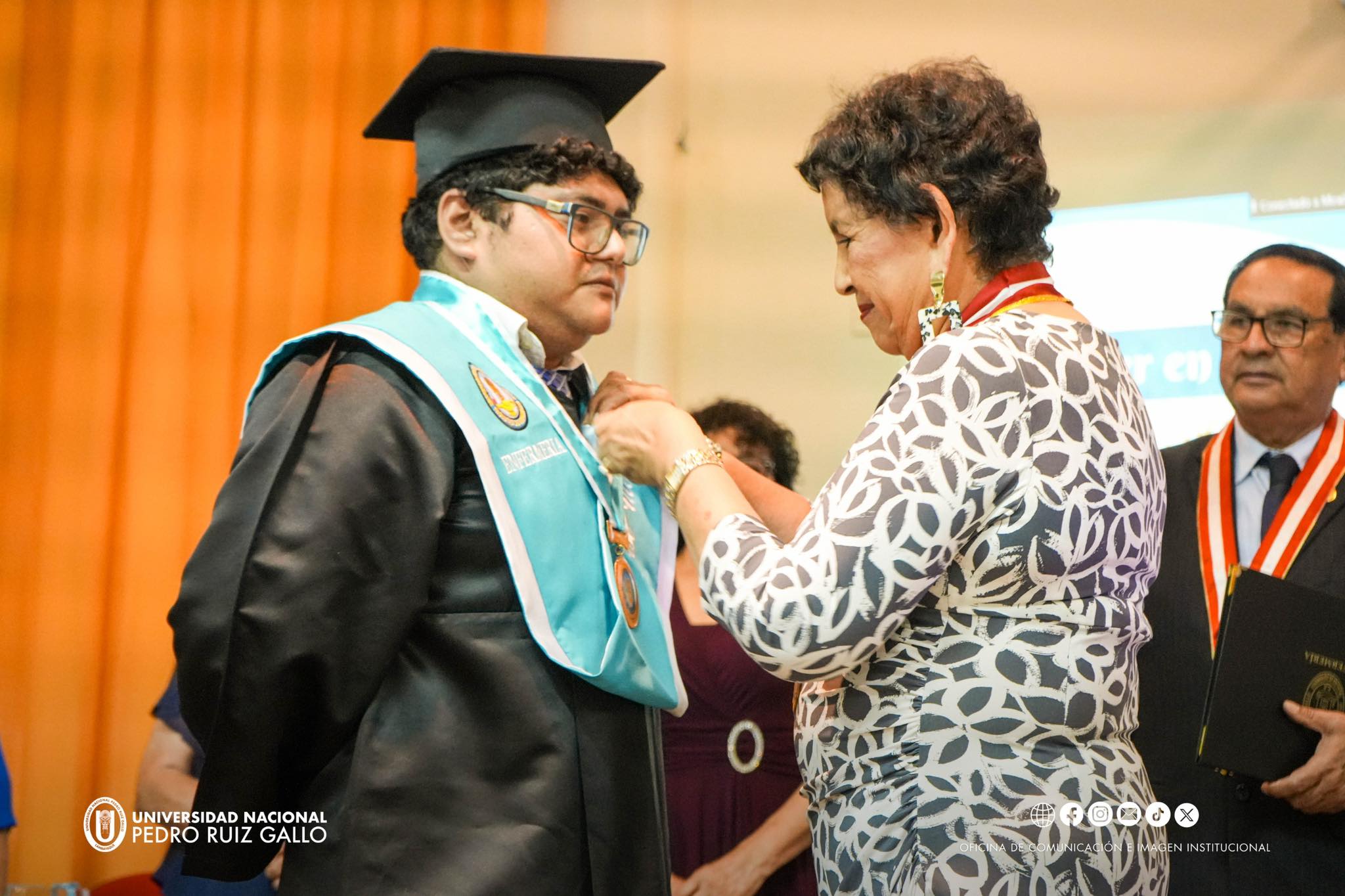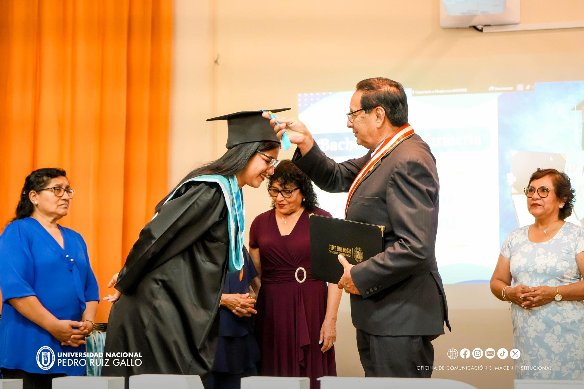 El acto contรณ con la presencia del rector de la UNPRG, Dr. Enrique Cรกrpena Velรกsquez, y de la decana de la Facultad de Enfermerรญa, Dra. Rosario Verรกstegui Leรณn, asรญ como de madrinas, docentes y familiares, quienes acompaรฑaron con orgullo este momento significativo.