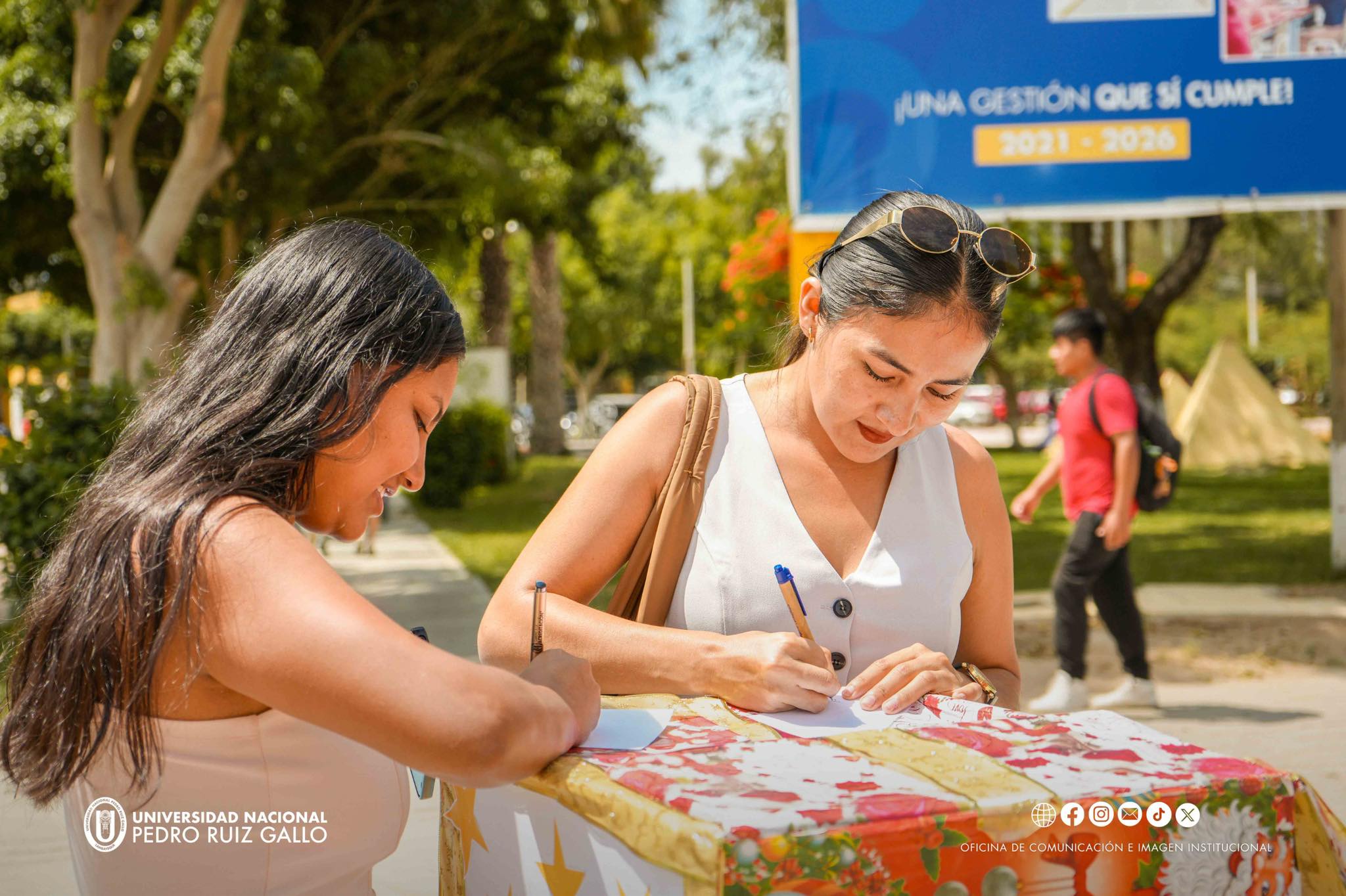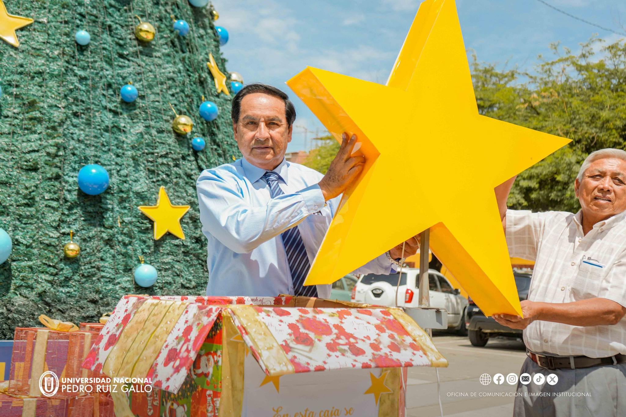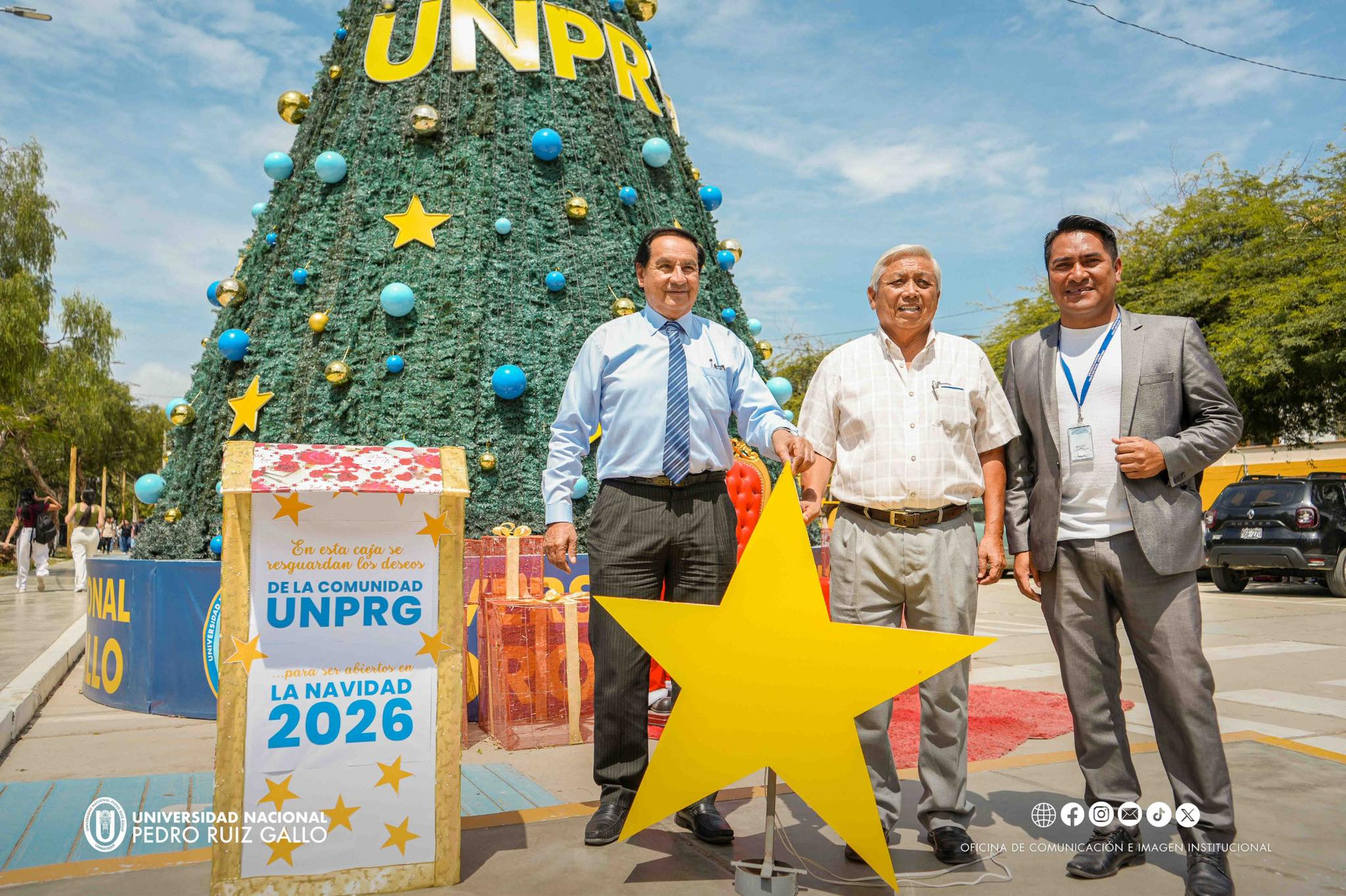 árbol navideño marcó el cierre de la Navidad en la Universidad Nacional Pedro Ruiz Gallo, en un momento sencillo pero significativo que reunió a nuestra comunidad universitaria en torno a la esperanza y los buenos deseos; estudiantes y personal administrativo dejaron mensajes para el próximo año en una caja que simboliza los sueños compartidos de la UNPRG, a los que también se sumó el rector, Dr. Enrique Cárpena Velásquez, dejando su deseo y reafirmando el compromiso de seguir construyendo juntos una universidad unida y con visión de futuro.
